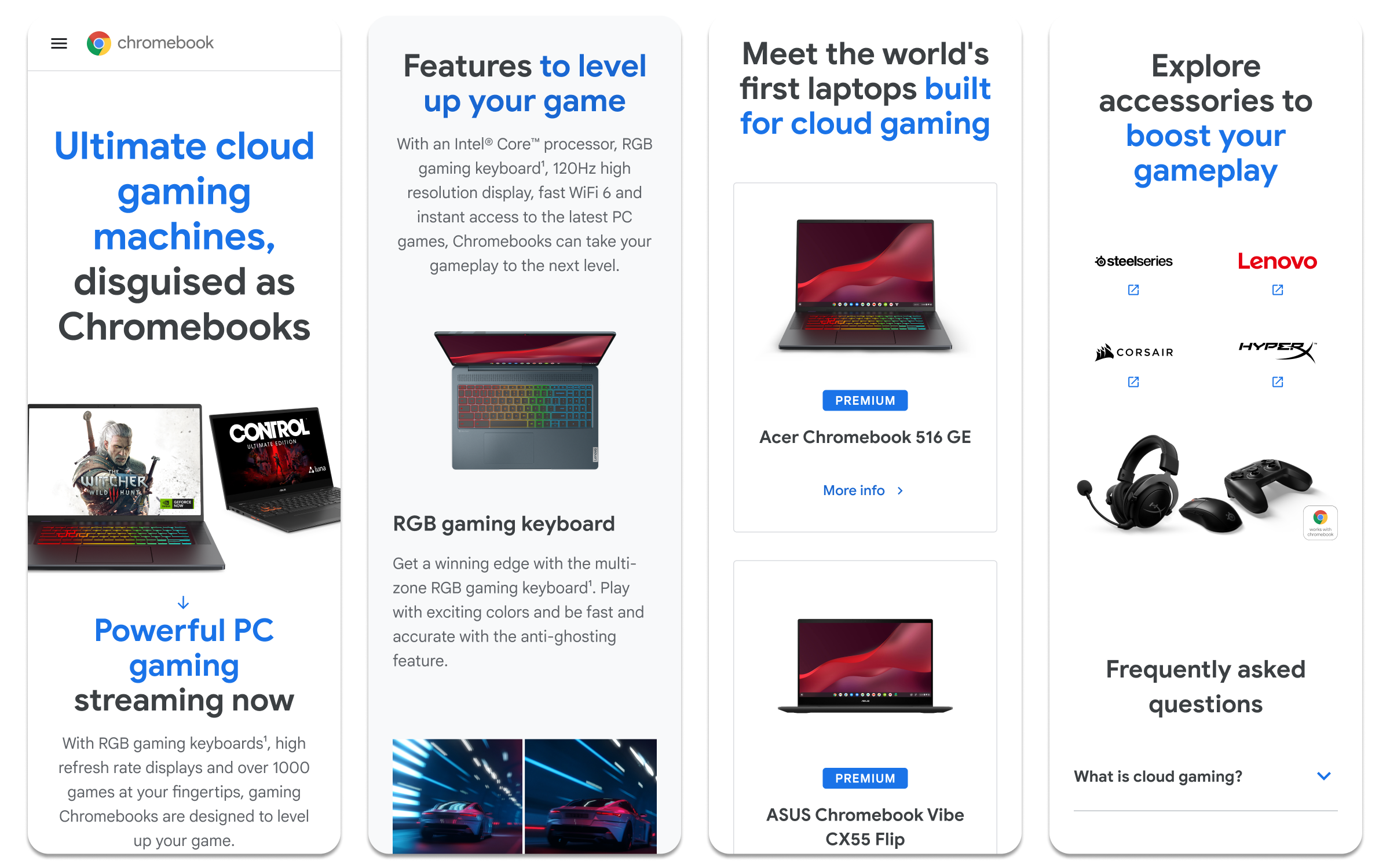 [2022] Redesigned the Google Chromebook (Google for Gaming) landing experience to better align messaging, visual identity, and user engagement — transforming a technically driven product page into a compelling, human-forward platform that communicates the power and possibilities of Chromebook for gaming.